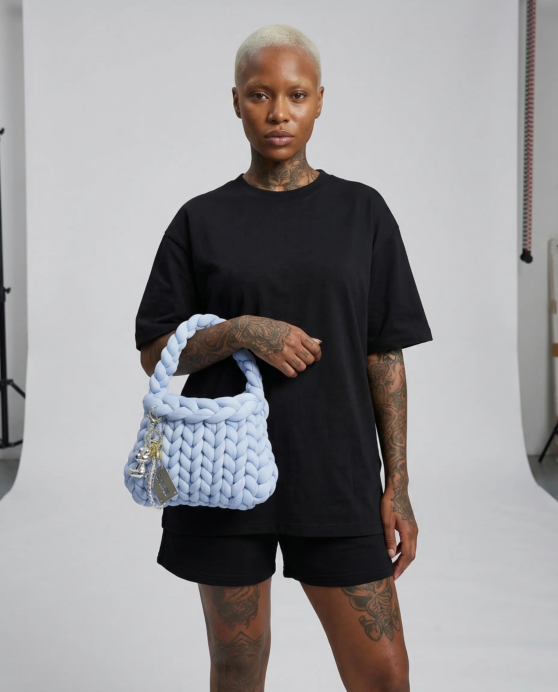 A sculptural handbag defined by oversized braided construction and soft volume.