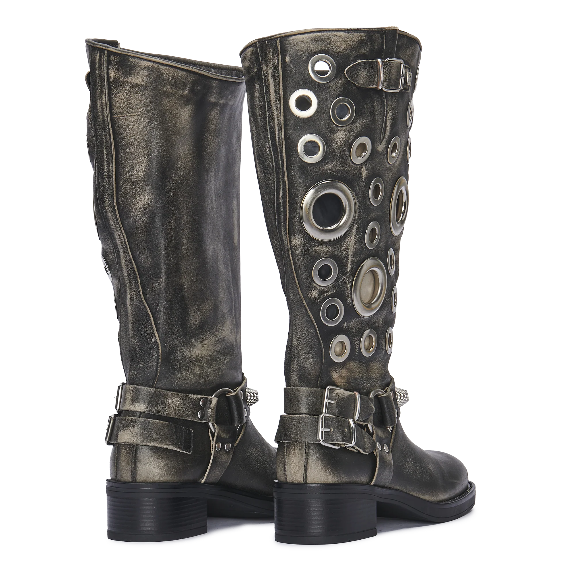 A bold knee-high boot crafted in washed vintage-effect black leather, designed to combine industrial strength with worn-in character.